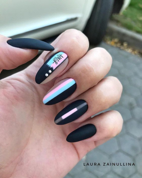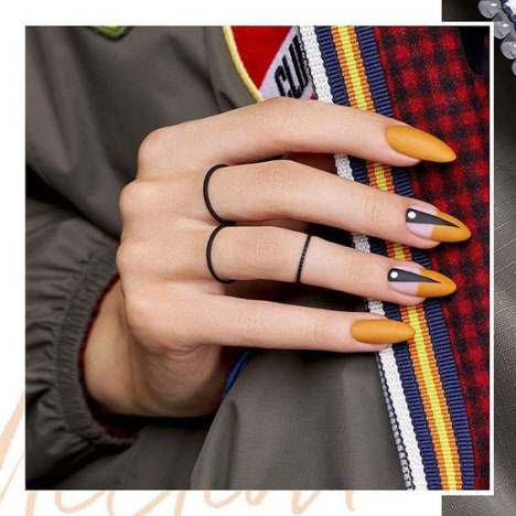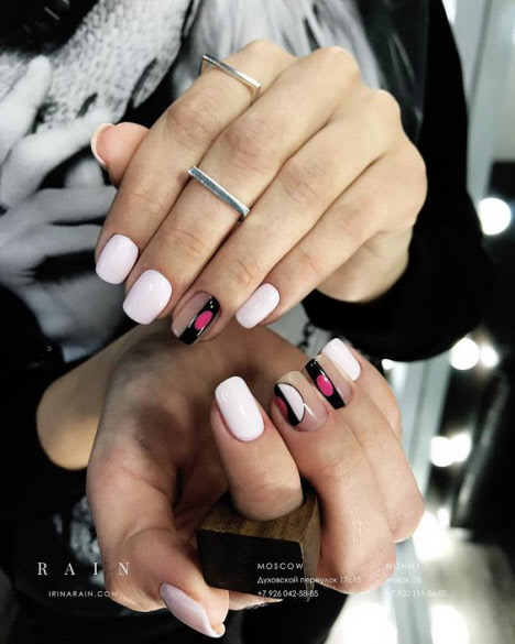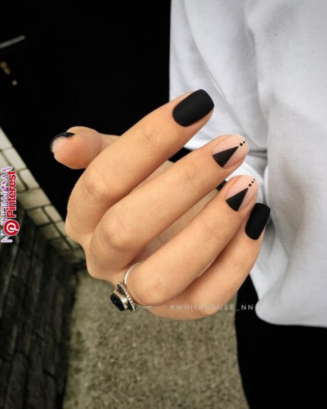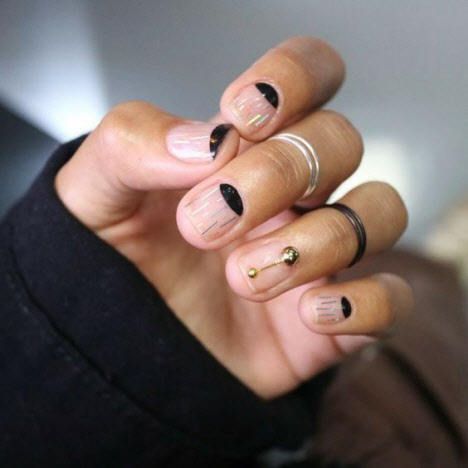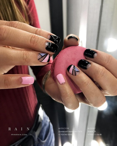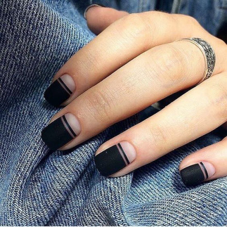 Kombinieren Sie eine Negativ-Space-Maniküre mit schwarzen, goldenen Streifen, Quadraten und Rauten, konzentrieren Sie sich auf einen oder zwei Nägel. Oder eine monochrome Maniküre, bei der ein unbemaltes Fenster in der Mitte verbleibt und die Form des Fensters sehr unterschiedlich sein kann.