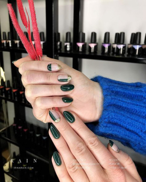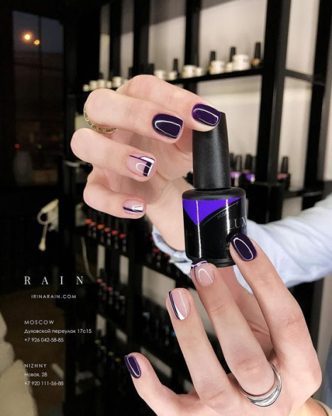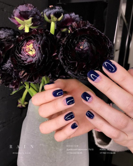 Die Negativ-Space-Maniküre in dunklen Farben sieht sehr stilvoll und hell aus, eine solche Maniküre wird nicht unbemerkt bleiben. Es kann eine bescheidene minimalistische Maniküre mit einer minimalen Anzahl von Mustern und Formen auf den Nägeln sein, und gleichzeitig kann es ein sehr komplexes Design mit vielen Formen sein.