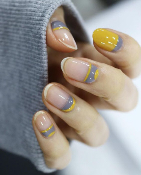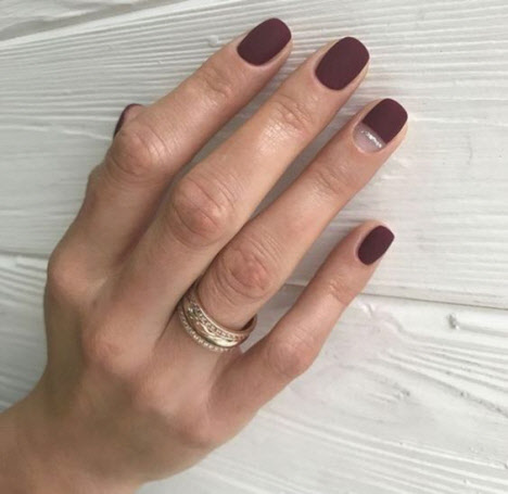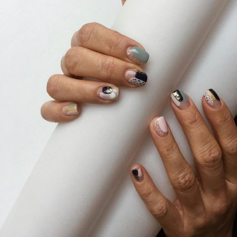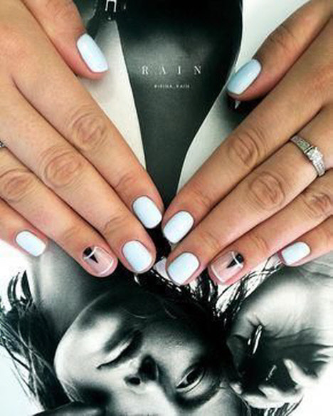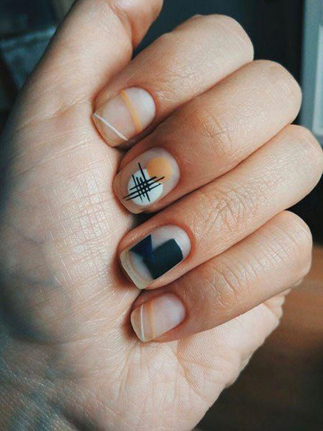 Auf kurzen Nägeln können Sie auch eine Negativ-Space-Maniküre in einer Vielzahl von Variationen (Geometrie, Verlauf, mit Folie, abstrakt, lunar) in einer glänzenden oder matten Textur bedenkenlos durchführen. Passen Sie nur auf, dass Sie Ihre Nägel nicht überladen.