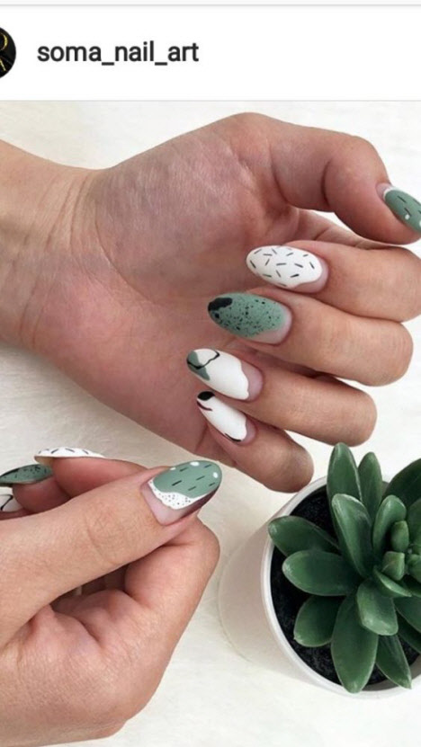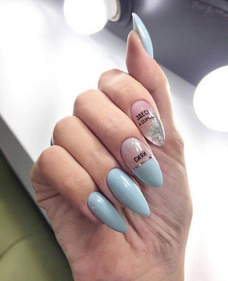 Lange Nägel sind ein großartiges Material für die Erstellung einer Negativraum-Maniküre. Sie können Maniküre mit Folie, Kamifubuki, Pailletten, Kieselsteinen und originellen Designs erstellen.