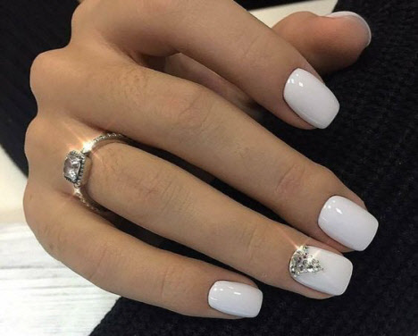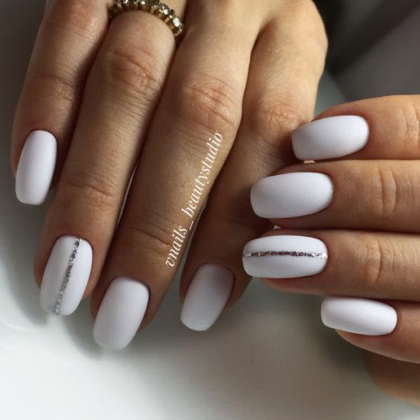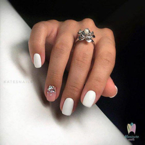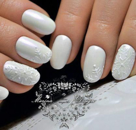 Weiße Maniküre wirkt lakonisch und gleichzeitig sehr festlich und stilvoll. Im Winter ist eine Maniküre in dieser Farbe genau das Richtige, denn wir verbinden den Winter mit Weiß, mit flauschigen weißen Schneeflocken können sie auf die Nägel gezeichnet oder mit funkelnden Kieselsteinen versehen werden.