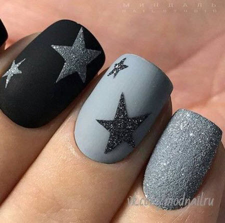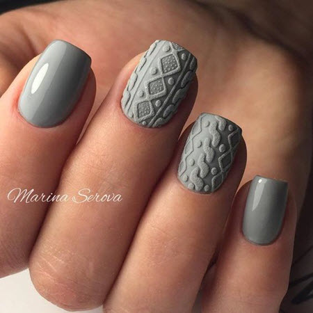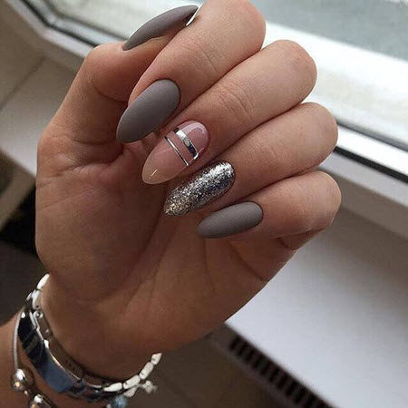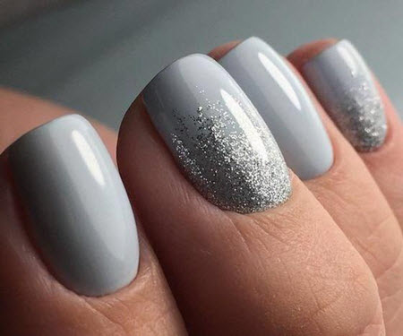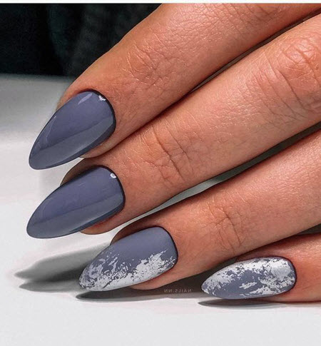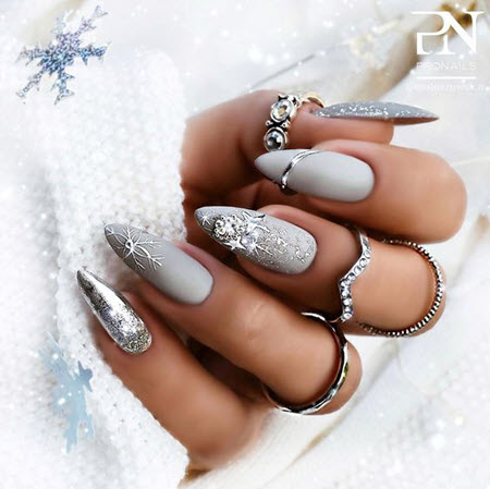 Ruhige Grautöne sind eine großartige Idee für eine Maniküre für das neue Jahr 2024, diese Farbe gilt als eine der vielseitigsten in der Farbpalette. Die Kombination aus grauem Lack und silbernem Glitzer oder Folie wird der Haupttrend des Jahres 2024 sein.
