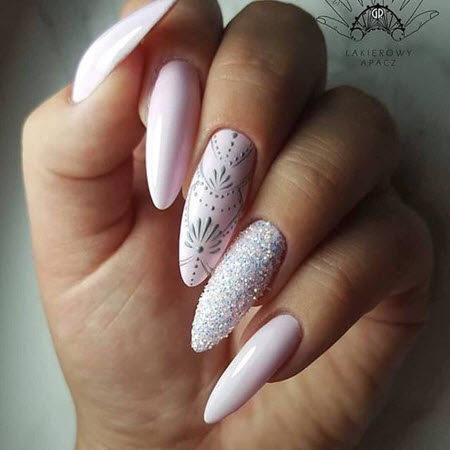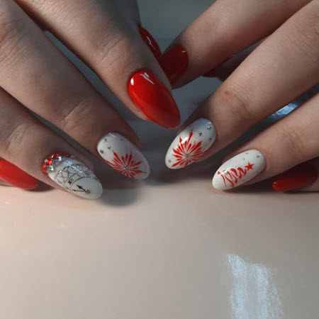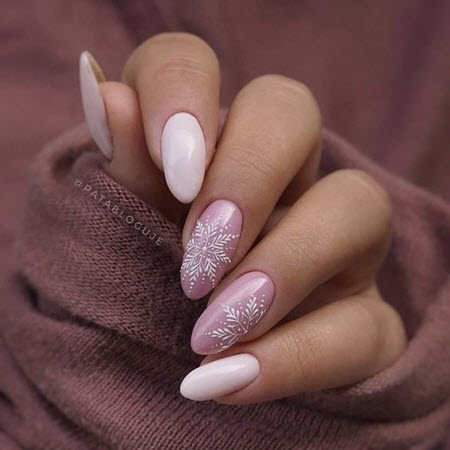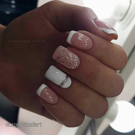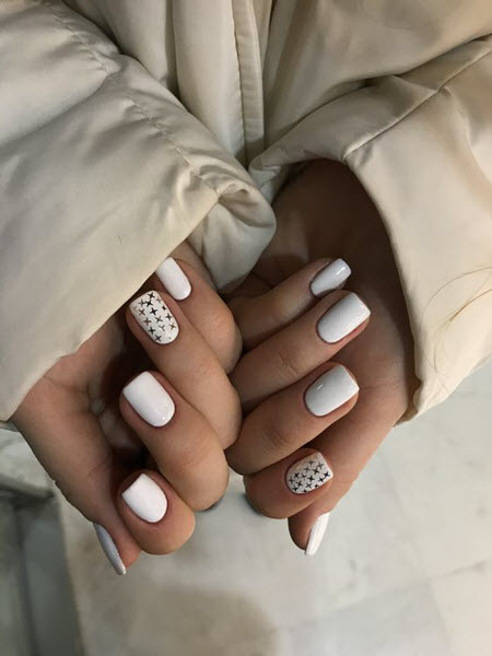 Die weiße Farbe des Lacks wird mit vielen Lacktönen kombiniert, diese Farbe kommt nicht aus der Mode, und Sie können damit viele verschiedene Optionen für die Neujahrsmaniküre machen, indem Sie ein Muster, Kieselsteine und Funkeln hinzufügen.