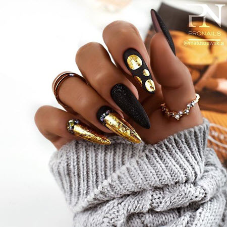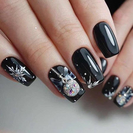 Eine exquisite schwarze Maniküre mit schönem Design passt zu Ihrer besten Maniküre zu Silvester 2024. Schwarzer Lack passt gut zu Funkeln und Steinen, was eine großartige Idee für eine Silvester-Maniküre wäre.