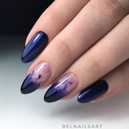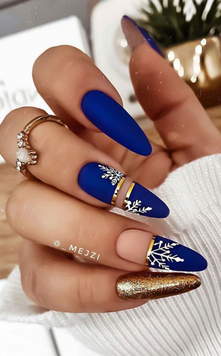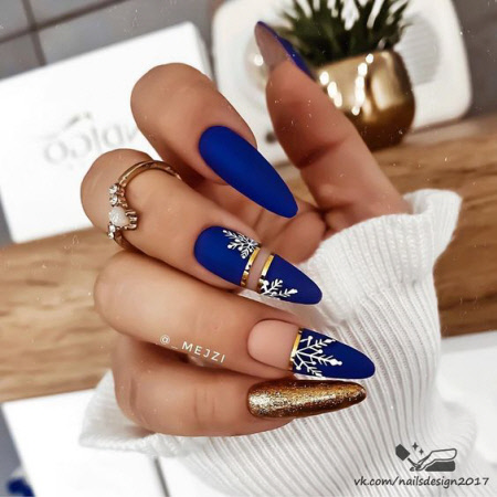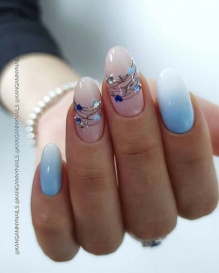 Blau wird in einer Neujahrsmaniküre großartig aussehen, wenn Sie sich in die kühle, belebende Wintersaison einfügen müssen. Französische Maniküre in Blau, Ombre-Design, Negativraum, Zeichnungen von Schneeflocken und anderen Neujahrsattributen werden relevant sein.