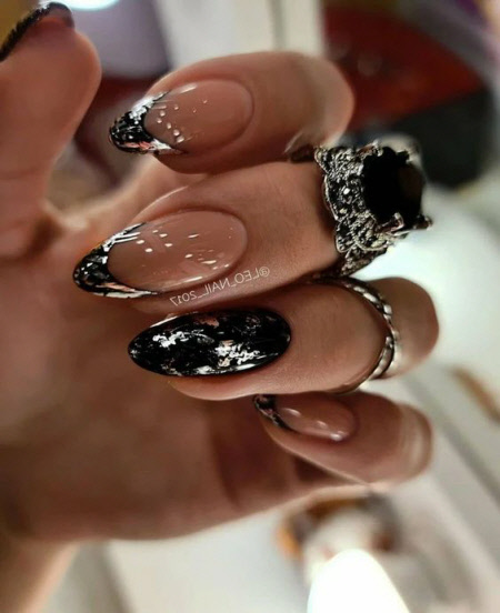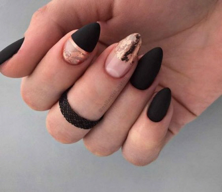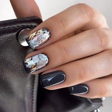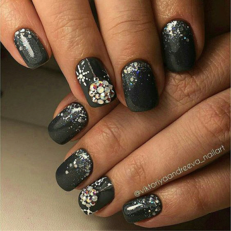 Schwarzer Nagellack passt zu jeder Jahreszeit ihrer Kunst. Fügen Sie in der schwarzen Maniküre des neuen Jahres einfach festliche Elemente hinzu: Sterne, Schneeflocken, Neujahrsspielzeug, Muster, die oft auf Pullovern zu sehen sind, wählen Sie, was Ihnen gefällt.