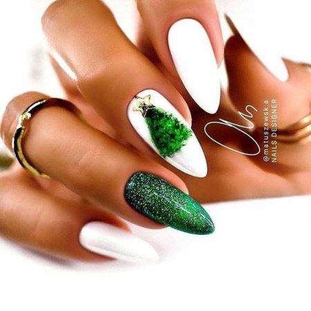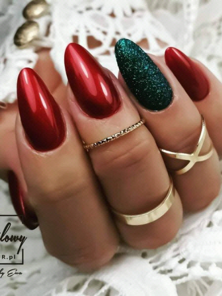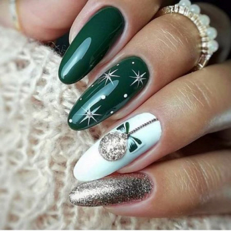 Grüntöne von Lacken sind die traditionelle Farbe der festlichen Neujahrszeit. Grün sieht gut zu Silvester-Nageldesigns 2024 aus, es passt gut zu Weiß-, Rot- und Nude-Lackpaletten sowie zu verschiedenen Glitzertönen.