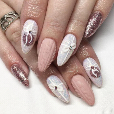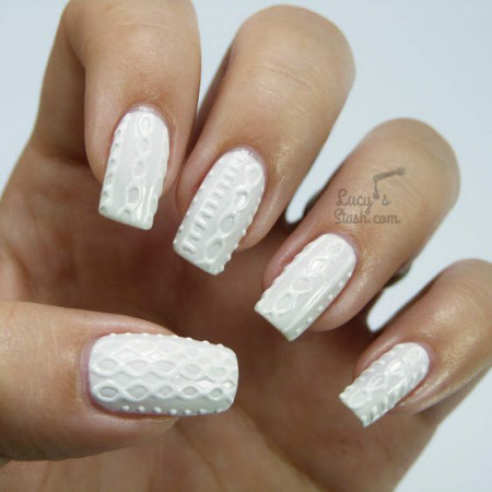 Ein gestricktes Ornament kann auf alle Nägel aufgetragen werden oder einen oder zwei akzentuieren. In den meisten Fällen wird das Muster im gleichen Farbschema wie der Nagel selbst erstellt. Für mehr Glaubwürdigkeit wird Acrylpuder oder Samtsand auf das Ornament aufgetragen, um ein voluminöses und samtiges Muster zu erzeugen.
