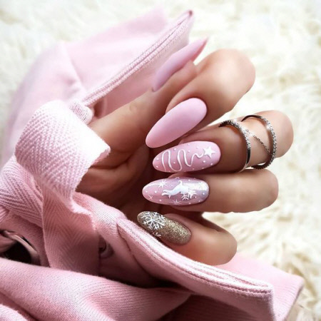 Neben der einfarbigen Beschichtung, die jedes Jahr immer beliebter wird, verdienen eine Vielzahl von Mustern in der Neujahrsmaniküre Aufmerksamkeit. Zeichnungen verwandeln die Maniküre und verleihen ihr einen gewissen festlichen Look.