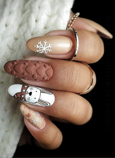 Liebhaber interessanter und nicht standardmäßiger Neujahrsmaniküre werden ihnen im Jahr 2024 auf jeden Fall das Design in Form von Tieren gefallen, meistens sind es Bären, Hasen, Rehe, Pinguine und Eulen. Darüber hinaus können Zeichnungen von Weihnachtsfiguren und thematische Inschriften verwendet werden. Bitte beachten Sie, dass die Zeichnung nicht auf allen Ringelblumen vorhanden sein muss, es reicht in Form eines Akzents auf einer oder zwei, während die Zeichnung auf diese Weise viel besser aussieht.