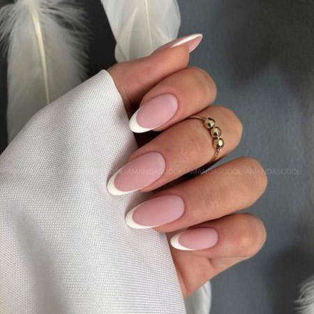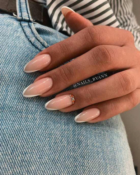 Bei dieser Maniküre beginnen die Nägel mit einer fleischigen Farbe und verblassen dann in eine weiche, fast weiße Farbe. Dadurch entsteht ein wunderschönes französisches Ombre. Dieses Design sieht sehr elegant aus und kann jeden Tag getragen oder für einen besonderen Anlass ausgewählt werden, indem ein paar Kieselsteine hinzugefügt werden.