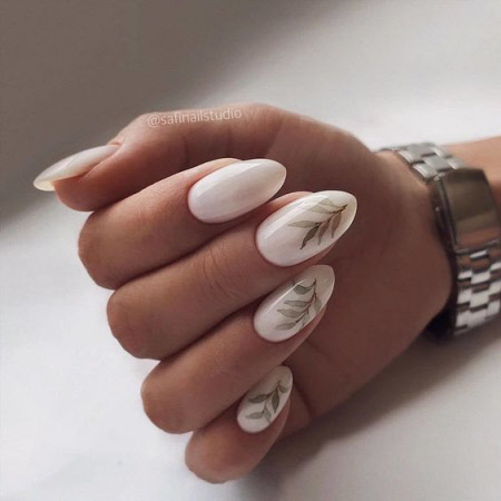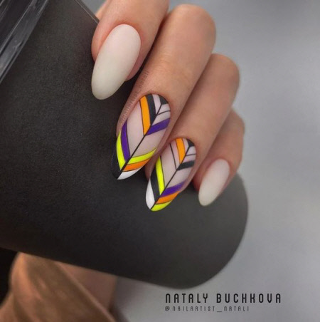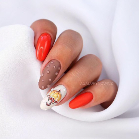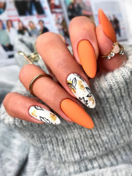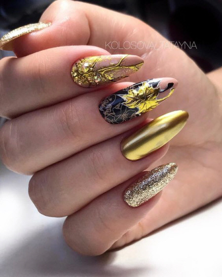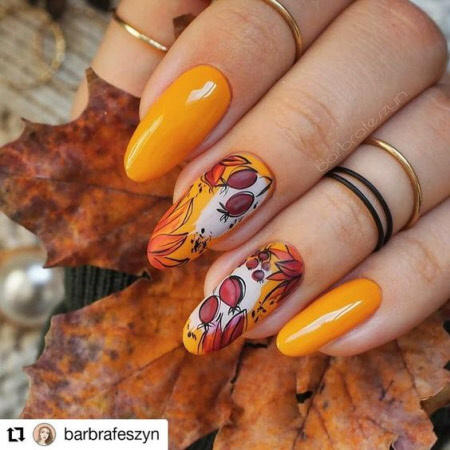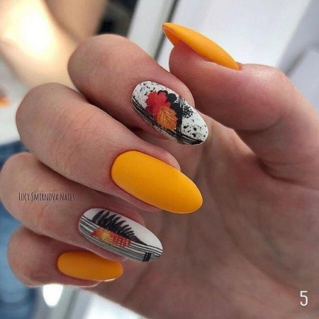 Die Herbstsaison der Maniküre ist ohne thematische Zeichnungen kaum vorstellbar, Zeichnungen mit Blättern und Zweigen in trendigen Herbstfarben sind besonders relevant. Auf langen Nägeln sind Herbstmuster noch spektakulärer.