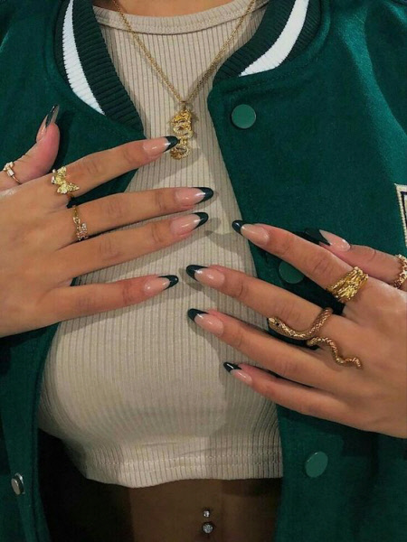 Eine French Manicure, mit weißem Nagellack akzentuiert, ist ein zeitloser und schicker Look für lange Nägel. Ein mattes Oberteil sorgt nur für mehr Effekt, im Herbst ist diese Version der Jacke einfach praktisch.