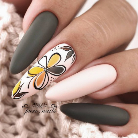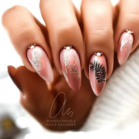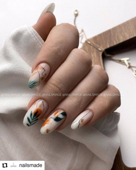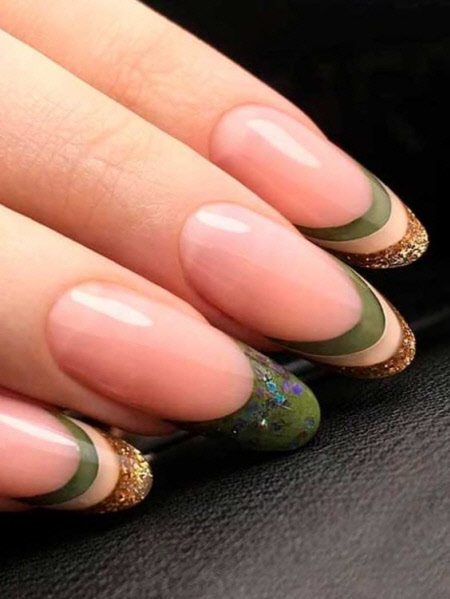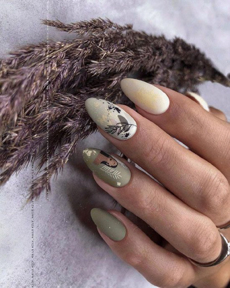 2021 ist die Kombination aus mattem und glänzendem Top in Mode, eine solche Maniküre sieht auf langen Nägeln besonders beeindruckend aus. Im Herbst können Sie sich für einen schönen Olivton in Kombination mit Nude- und Goldakzenten wie Pailletten entscheiden. Die olivgrüne Farbe schafft ein attraktives und einprägsames Nageldesign, und ein interessantes abstraktes Design auf nackten Nägeln wird die Maniküre in dieser Saison zum Trend machen.