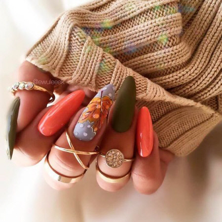 Eine mehrfarbige Maniküre mit Farbverlauf ermöglicht es Ihnen, die gesamte Farbskala der Herbstmanikürefarben in einem Design zu vermitteln. Dieses Design ermöglicht es Ihnen, mit Ihren Lieblingsfarben zu spielen und gleichzeitig das stilvolle Aussehen Ihrer langen Nägel zu erhalten.