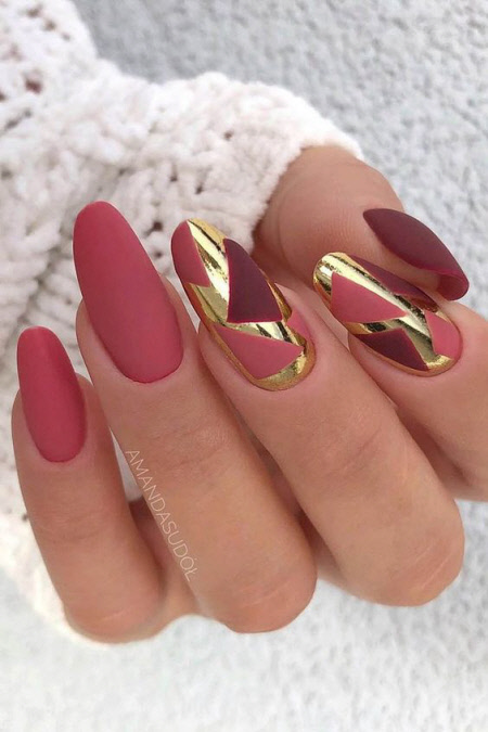 Matter Nagellack ist cool und sieht immer schick aus. Matte Herbstmaniküre für lange Nägel 2024 sieht am besten in dunklen Lacktönen aus, zum Beispiel Burgund, wie auf dem Foto unten: