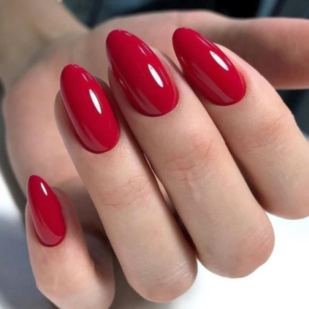 Die intensive rote Farbe des Nagellacks in den aktuellen Nageltrends 2024. Es ist einer der beeindruckendsten Farbtöne für die Maniküresaison im Herbst 2024.