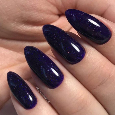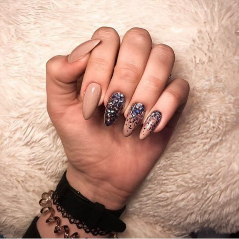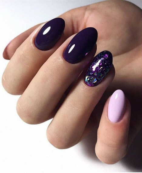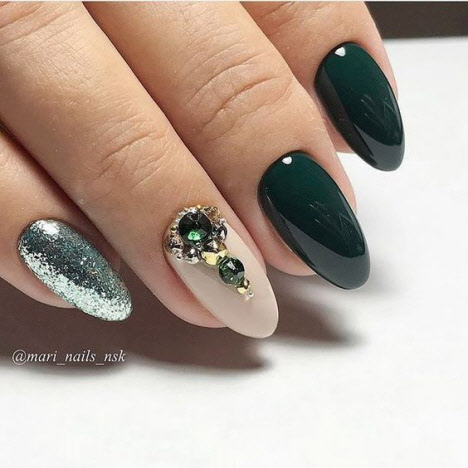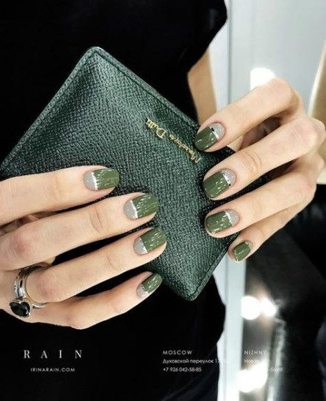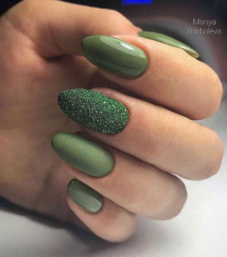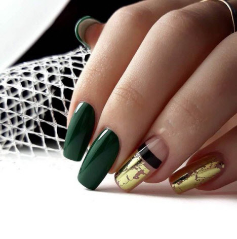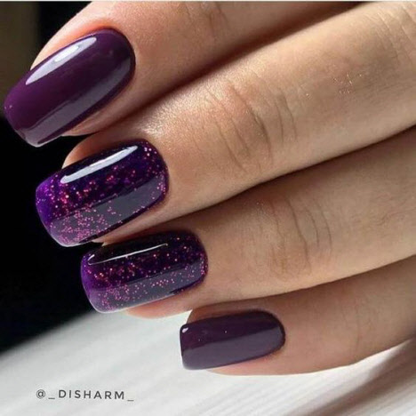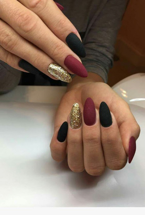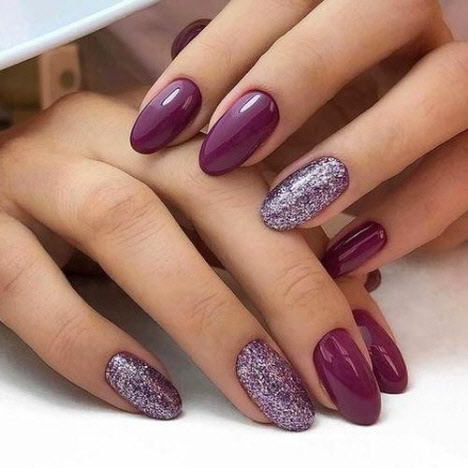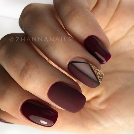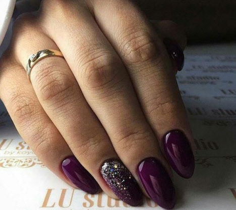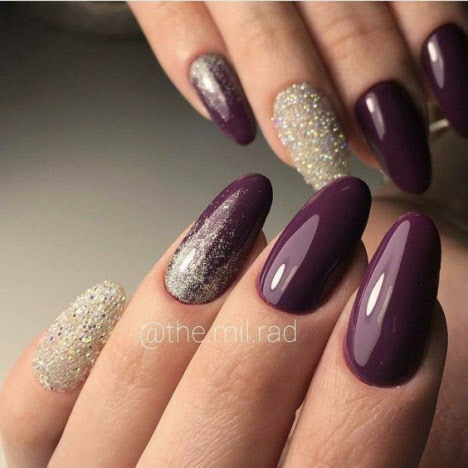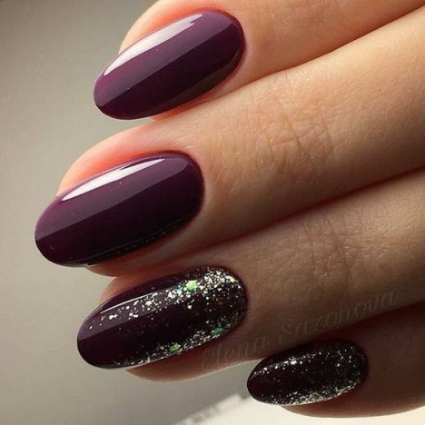 Die Kombination aus dunklen Lack- und Glitzertönen kommt nie aus der Mode. Und das nicht nur als festliche Variante der Maniküre, Glitzer wird bei der Maniküre schon lange im Alltag eingesetzt. In jedem der dunkleren Farbtöne können Sie ein wenig schimmerndes Gold hinzufügen und die Maniküre funkelt auf ganz andere Weise. Die Hauptregel ist hier, nicht mit Gold verrückt zu werden))) Es reicht aus, Akzente auf einem oder zwei Nägeln zu setzen, dies gilt auch für andere Schattierungen von Funkeln.