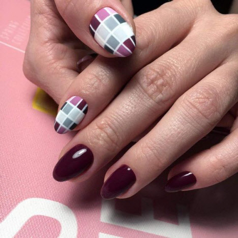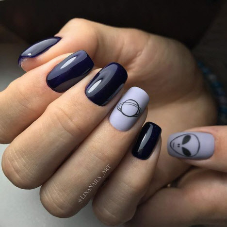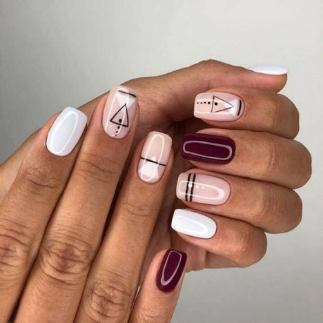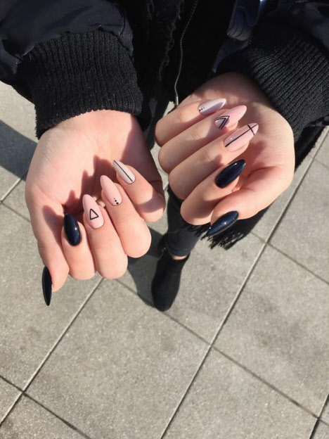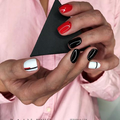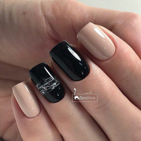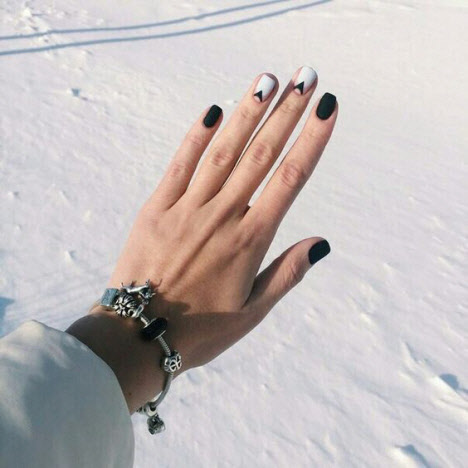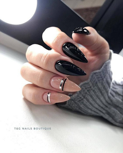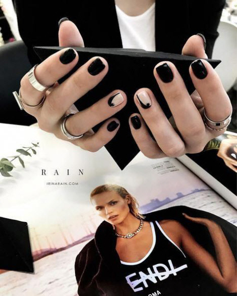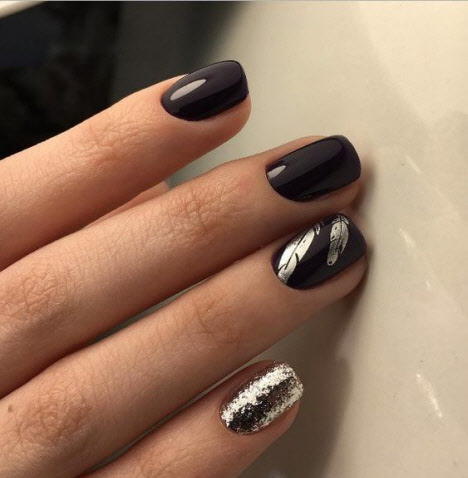 Eine Maniküre in dunklen Farben sieht toll aus mit Steinen, Glitzer, Konfetti, Folie, ausgelegt in verschiedenen Ausführungen, sowie in minimalistischem Design (Linien, Formen, Punkte, Ornamente). Erstellen Sie eine interessante Maniküre, indem Sie mehrere Techniken gleichzeitig mischen und die üblichen Manikürestandards verbessern.