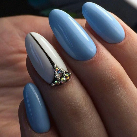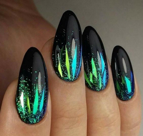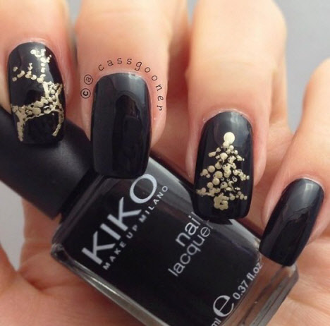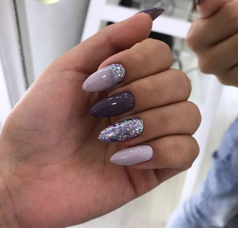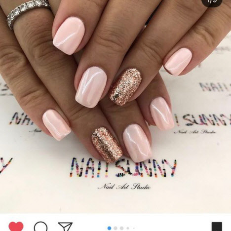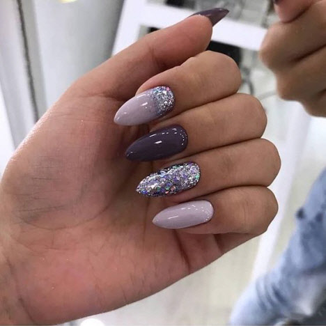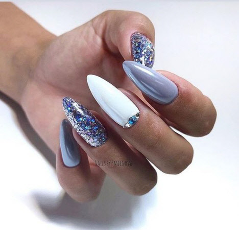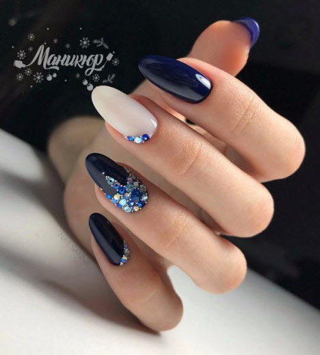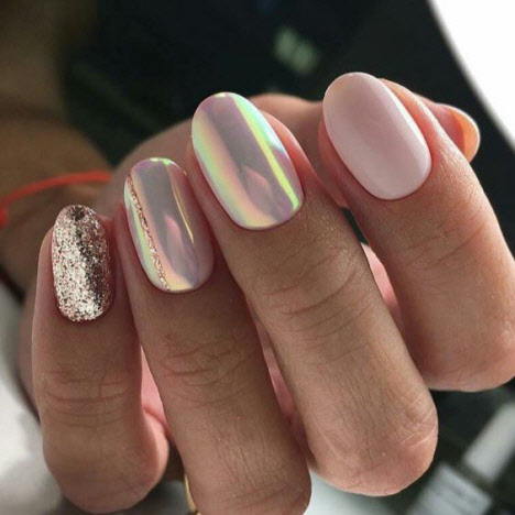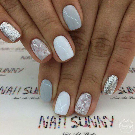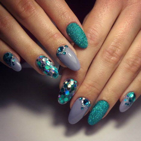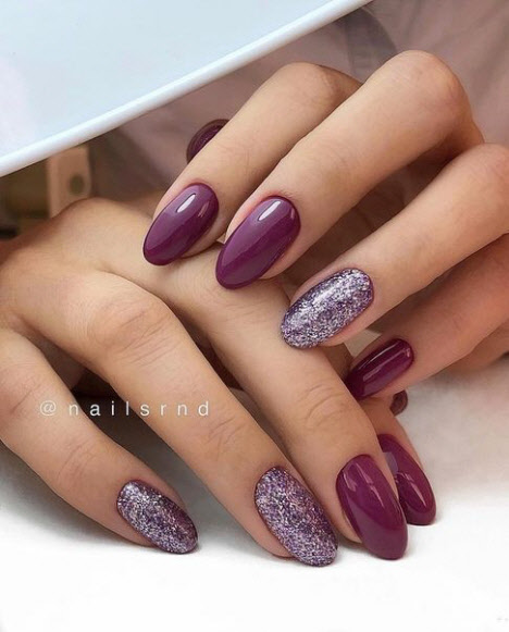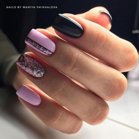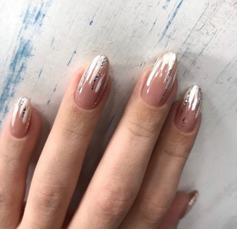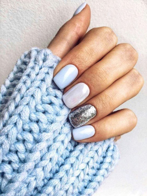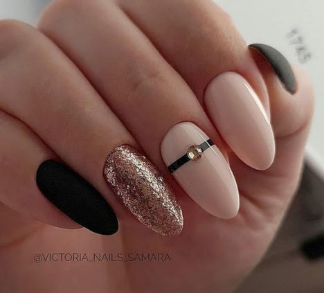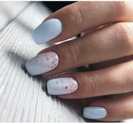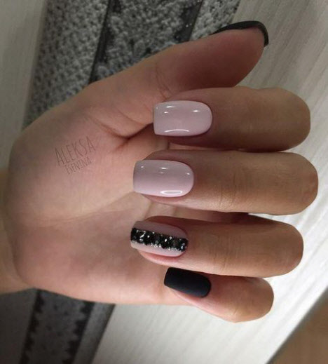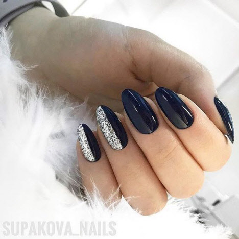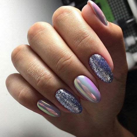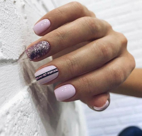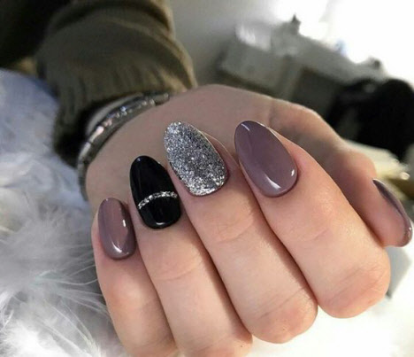 Wenn, wenn nicht im Winter, bei der Maniküre der Verwendung von Glitzer und Glitzer freien Lauf lassen. Sie passen gut zu Nudetönen und satten dunklen, insbesondere zu Schwarz, Blau und Burgunder.