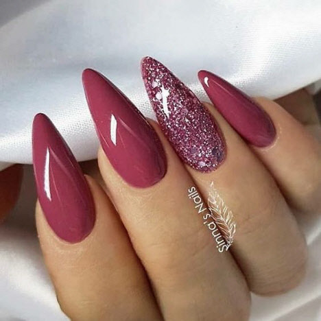 Dunkle, lebendige und kräftige Farben sehen auf Mandelnägeln luxuriös aus. Marsala-Farbe, dunkle Schokoladen-, Blau-, Pflaumen-, Grau- und Schwarztöne sehen auch ohne zusätzliche Dekoration toll aus und alle diese Farben sind perfekt für eine matte Maniküre.