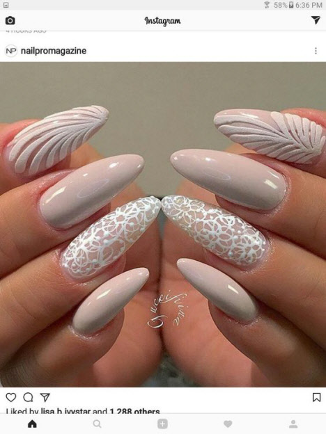 Nude Maniküre auf mandelförmigen Nägeln sieht sehr zart und raffiniert aus, alle Schattierungen von Beige, Creme, Vanille und natürlich Marshmallow machen Ihre Maniküre makellos. Auch das Dekorieren ist in pastellfarbener Maniküre willkommen.
