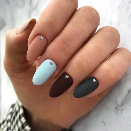 Lange Nägel mit mattem Top oder mattem Lack sehen gerade im Winter immer sehr magisch aus. In einem solchen Design können sowohl helle als auch pastellfarbene oder tiefe Farbtöne verwendet werden. Die Brillanz der Strasssteine wird durch das gedeckt matte Finish einfach unglaublich betont. Im Winter können Sie matte Nägel auch mit Glitzer, Kamifubuki, Folie, Muster oder Muster dekorieren.
