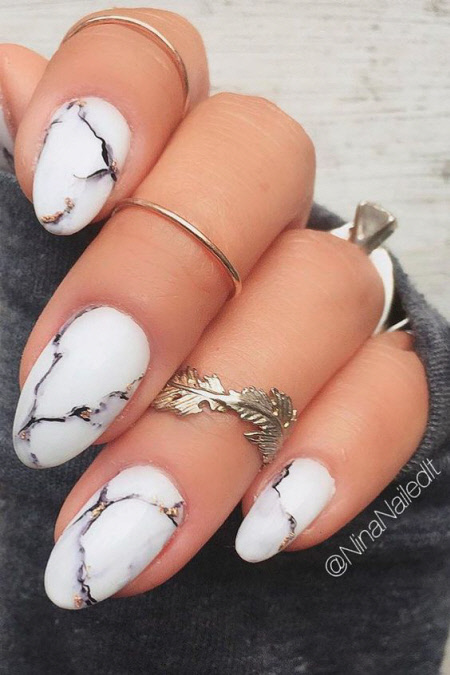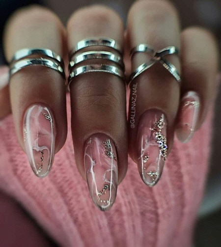 Marmormaniküre wirkt auf langen ovalen und mandelförmigen Nägeln sehr sanft und zurückhaltend. Schauen Sie sich das Foto für Trendideen der Marmormaniküre für die Wintersaison 2024-2025 an: