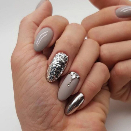 Wenn Sie Ihren Nägeln mit kleinen Details Eleganz verleihen möchten, dann ist in diesem Winter eine Maniküre mit Steinen und Strasssteinen perfekt. Kieselsteine können schön in einem Muster angelegt oder einfach an der Basis des Nagels aufgetragen werden, Hauptsache, das Maß einhalten, Sie sollten nicht alle Nägel mit Strasssteinen auftragen, es ist besser, sich auf einen oder zwei zu konzentrieren.