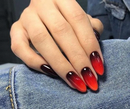 Das Ombre-Design auf langen Nägeln sieht einfach fantastisch aus, diese Maniküre wird an Ihren Händen nicht unbemerkt bleiben. Ombre muss nicht in Nude-Tönen sein, obwohl ein solches Design sehr schön aussieht. In diesem Winter können Sie dunkle trendige Lacktöne ausprobieren, Ombre sieht unglaublich schick aus mit rotem Lack, Lila, Blau.