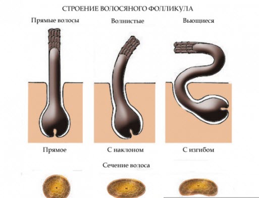 Die Struktur des Haarfollikels (Lage und Form) bestimmt, was unser Haar sein wird, wenn es rund ist, dann ist das Haar glatt, wenn es oval und schräg, bohnenförmig und gebogen ist - lockig und lockig.