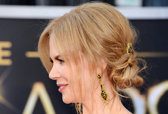 Ein romantisches Bild, an das sich Nicole Kidman erfolgreich genähert hat, sie ließ einen Knall und ein paar weitere Strähnen auf der Vorderseite frei und sammelte mit Hilfe von unsichtbaren Stecknadeln, Haarnadeln und einer schönen Brosche einen Haufen.