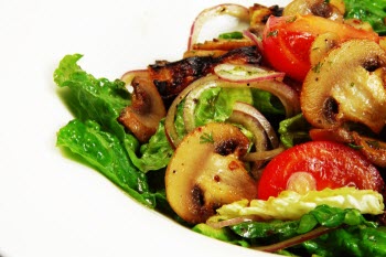 Abendessen: Salat, Pilz- oder Gemüsesuppe, eine Scheibe Brot.