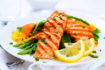 Abendessen: Fisch mit Gemüse, Brot; Saft.
