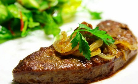 Abendessen: geschmorte Leber und ein Glas Orangen- oder Tomatensaft.