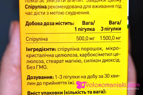 Meiner Meinung. Ich habe Spirulina nicht so sehr für die Haare gekauft, sondern für die Frühjahrsstärkung des Körpers und die Sättigung mit Vitaminen, Mikroelementen und anderen Nährstoffen. Nachdem ich viele Rezensionen im Internet gelesen hatte, entschied ich mich, mich auf Spirulina zu konzentrieren. Ich habe Spirulina in der Tschechischen Republik hergestellt, deren empfohlene Dosierung 1-3 Tabletten pro Tag beträgt, ich habe bei zwei Tabletten aufgehört.