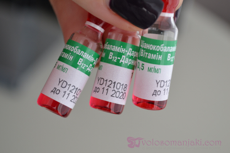 Wenn Sie Vitamin B12 intern einnehmen: die durchschnittliche tägliche Vitamin-B12-Norm für einen Erwachsenen beträgt 2,4 mg. Vitamin B12 ist im Haar sehr aktiv.